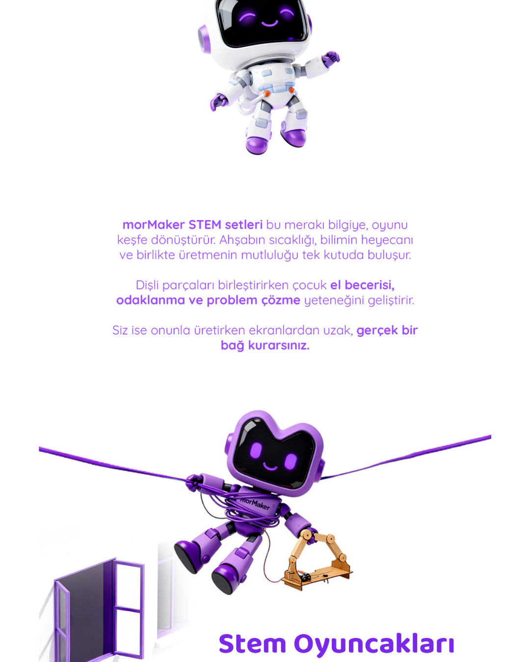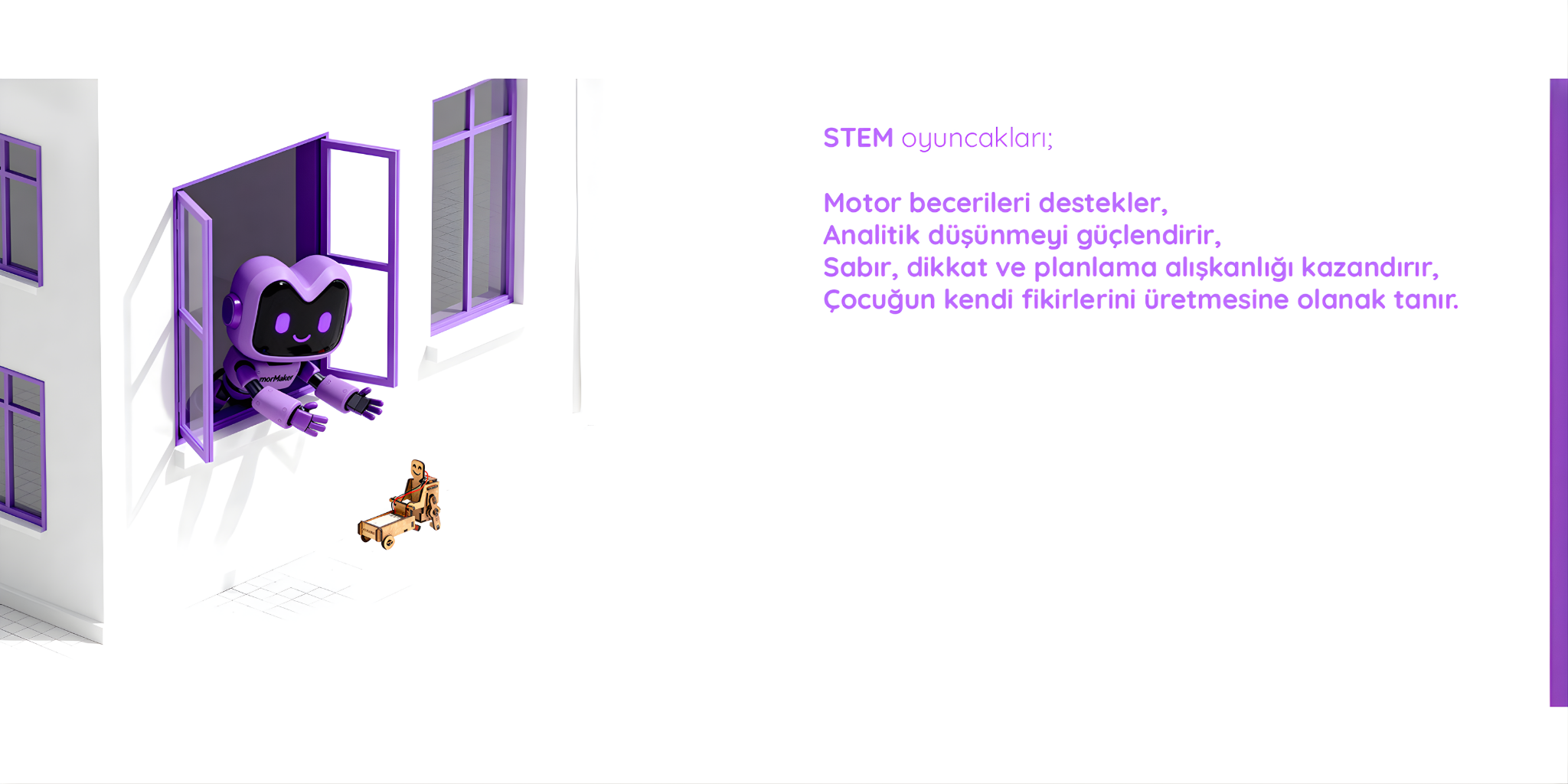 Ürünlerimiz; bilim, teknoloji, mühendislik, sanat ve matematiği bir araya getirerek çocukların analitik düşünme, problem çözme ve üretme becerilerini güçlendirmeyi amaçlıyor.