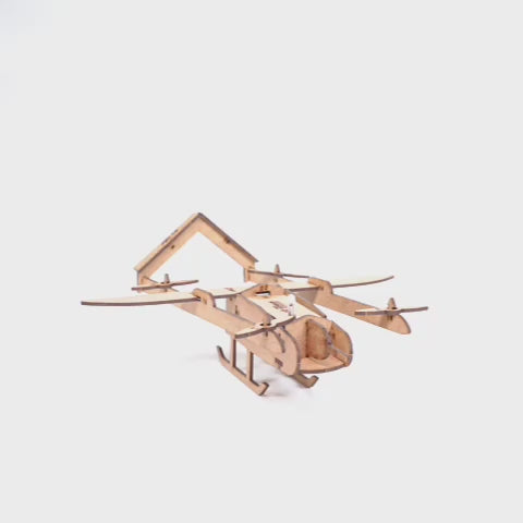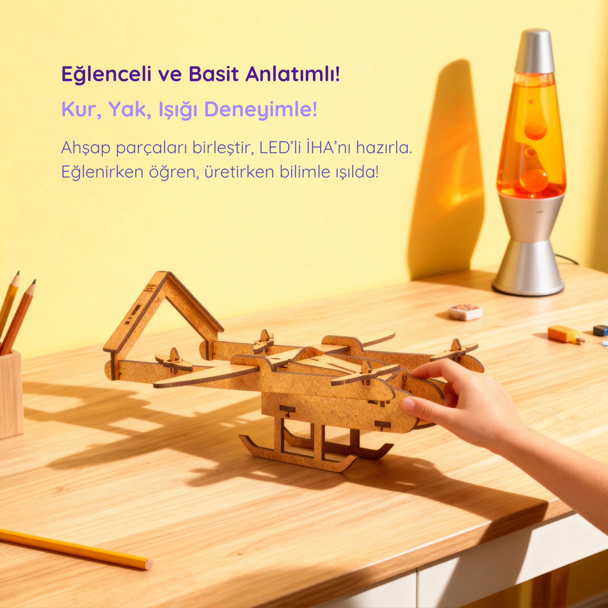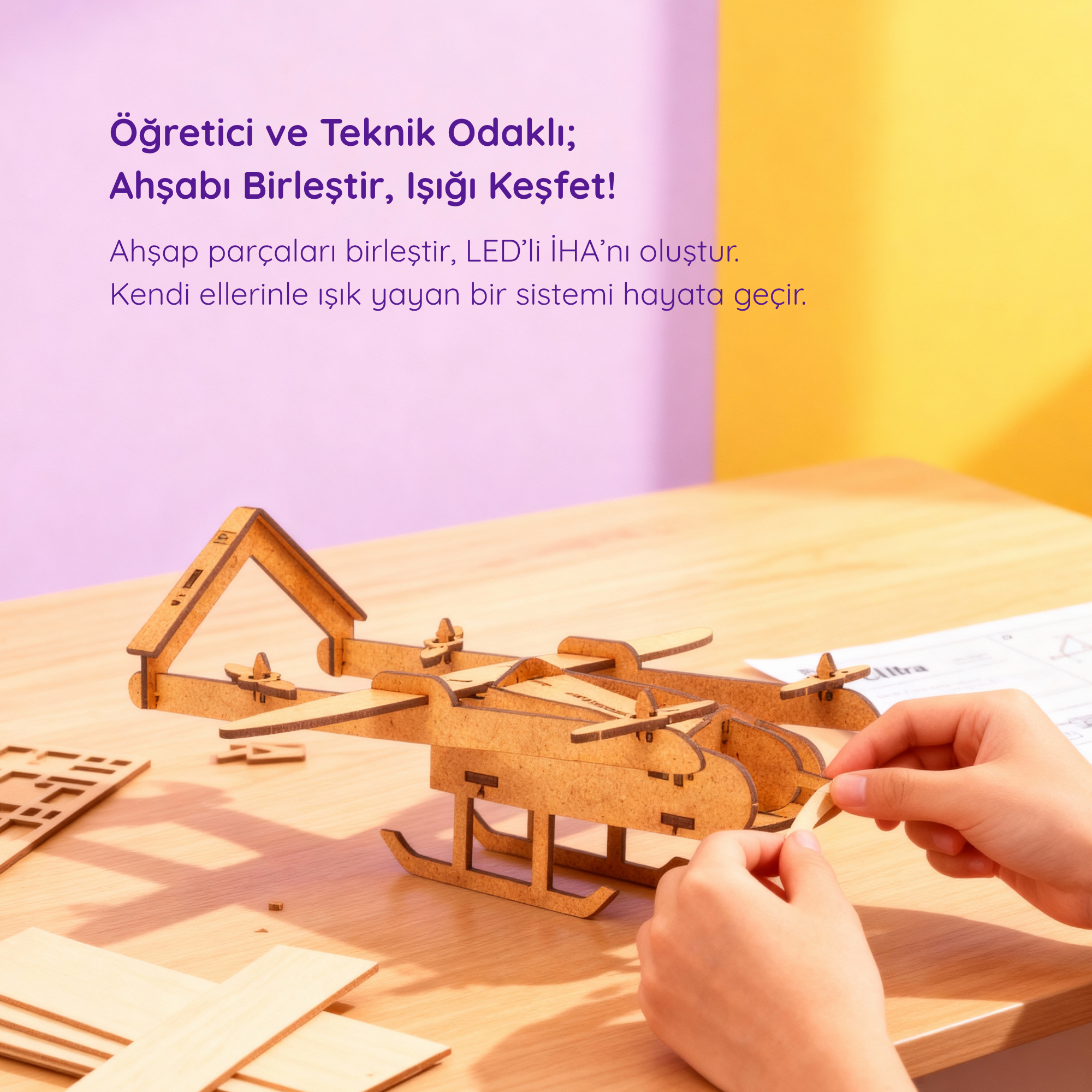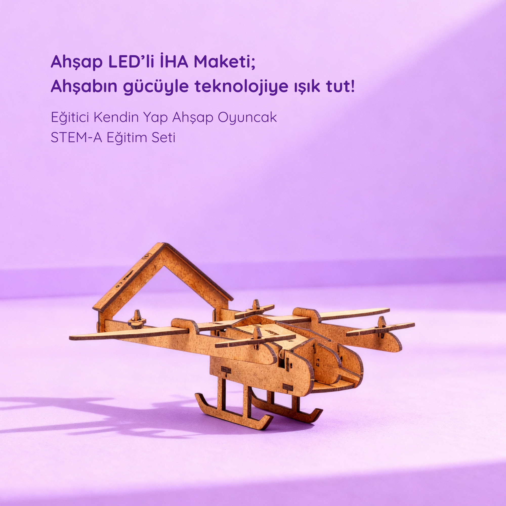 Ahşap LED'li İHA Maketi | İnsansız Hava Aracı | Kendin Yap Ahşap Oyuncak | STEM-A Eğitim Seti